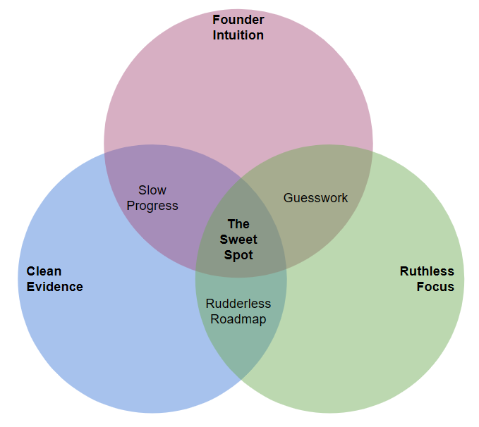 This leads us to the core paradigm of good product decisions for startups, which is that good product decisions sit at the intersection of founder intuition, clean evidence, and ruthless focus. At the earliest stages you need all three to build the right thing, the right way, at the right pace. Miss one and you hit a common failure mode: